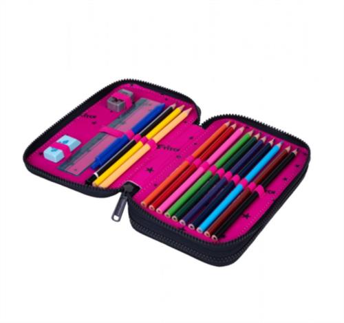 El estuche escolar Jumper de Coolpack viene totalmente equipado. En su interior lleva todo el material escolar necesario para ir al cole. Encontramos una selección de rotuladores de colores de punta fina con multiples colores también con diferentes gamas de colores. El JUMPER de Coolpack, se puede combinar con el resto de accesorios, como la mochila, o la fiambrera o las botellas de agua.